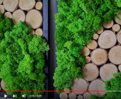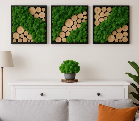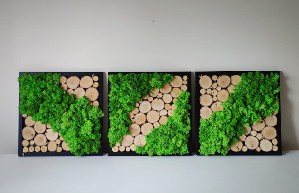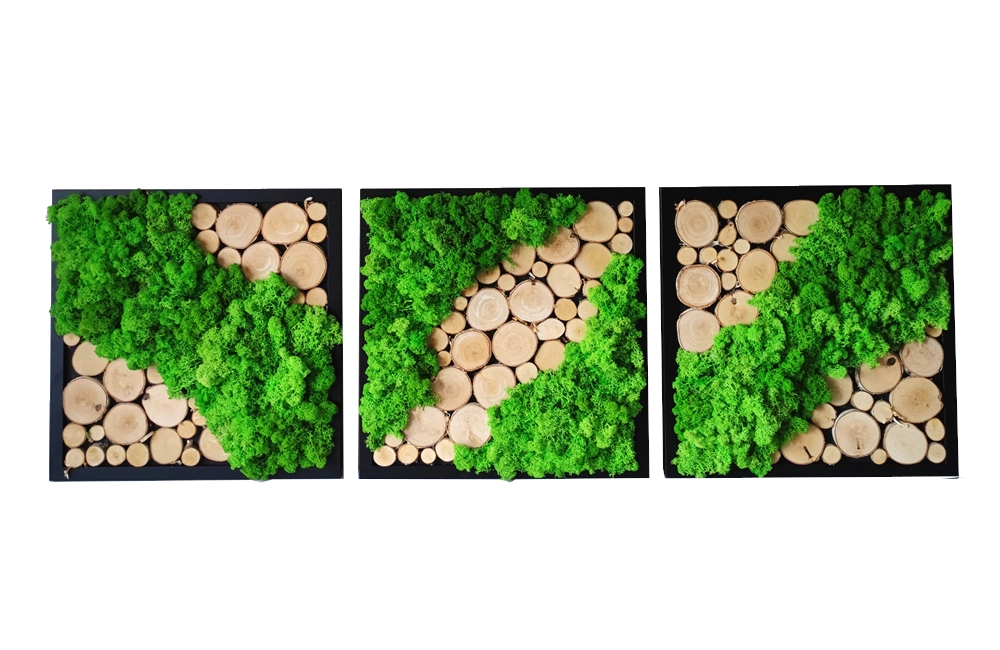 - kompozycja składa się z 3 obrazków, wypełnionych chrobotkiem oraz plastrami drewna
