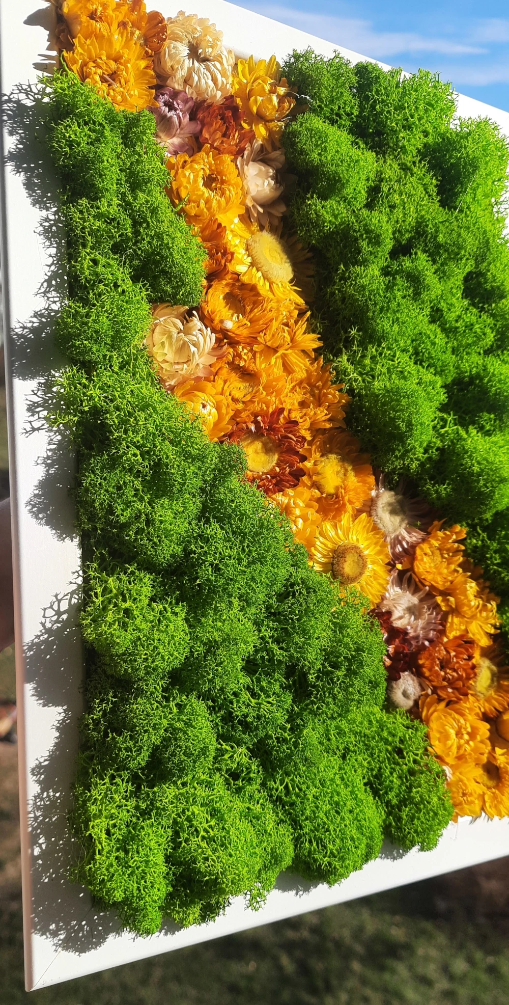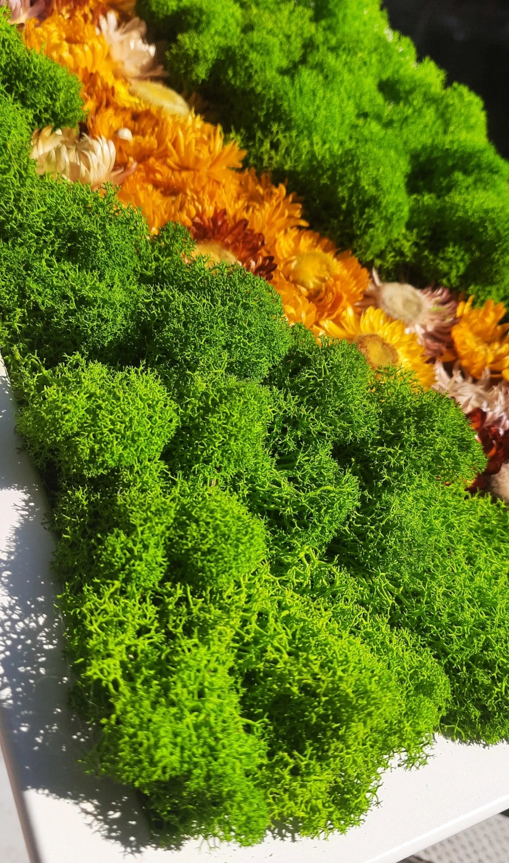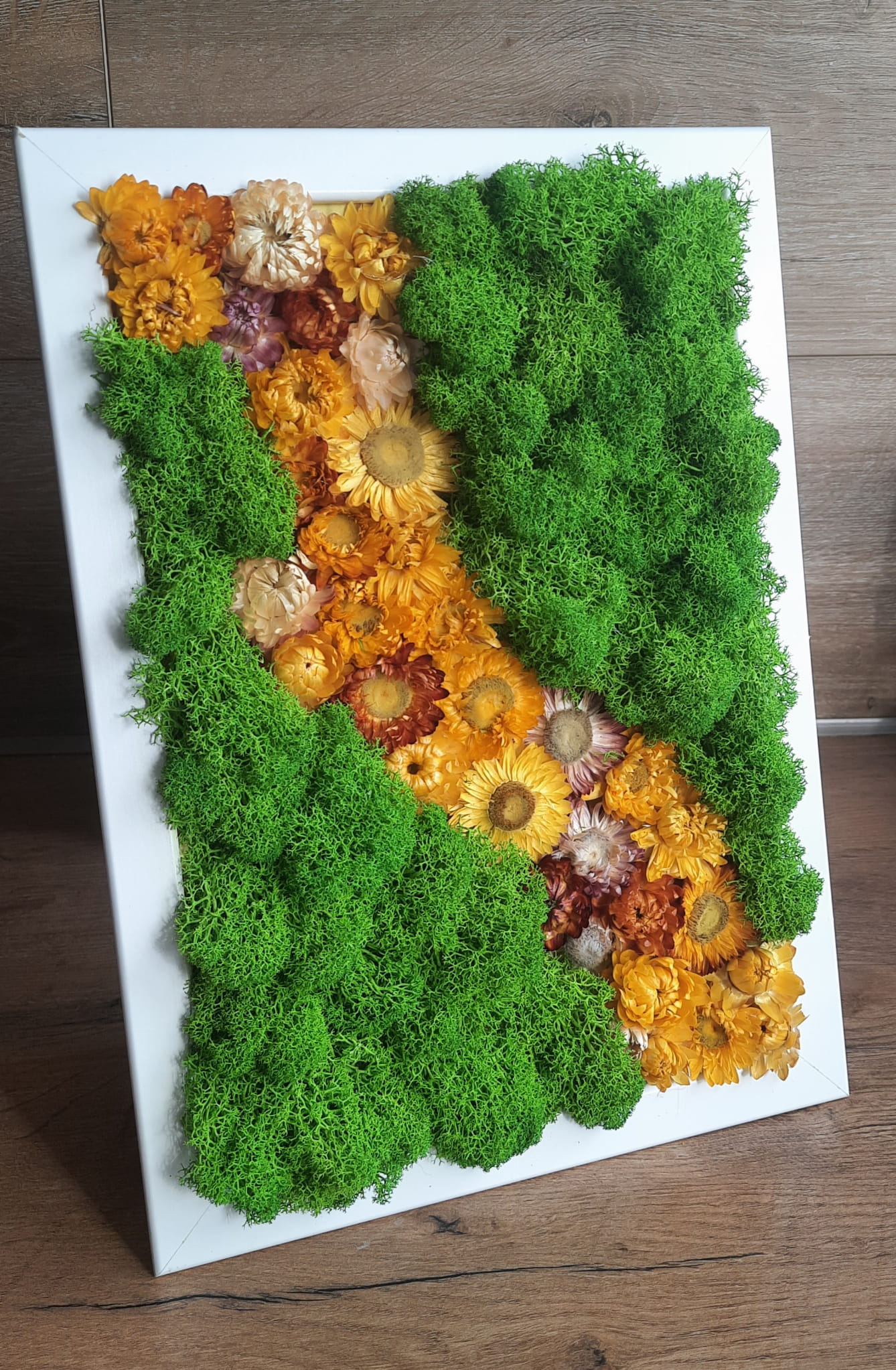 Chrobotek reniferowy z suszonymi kwiatami. Piękna dekoracja do powieszenia na ścianie lub postawienia na półce.