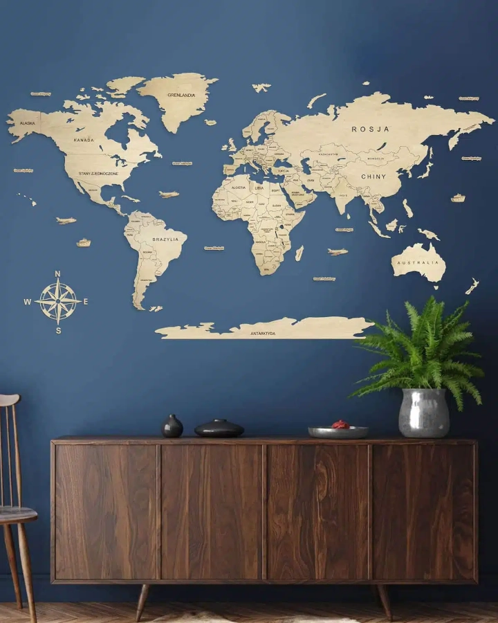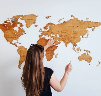 Drewniane Mapy Świata Classic z wygrawerowanymi granicami i nazwami państw, wykonana z naturalnej sklejki drewnianej. Odkryj naszą mapę świata, wykonywaną ręcznie przez artystów do dekoracji wnętrz!