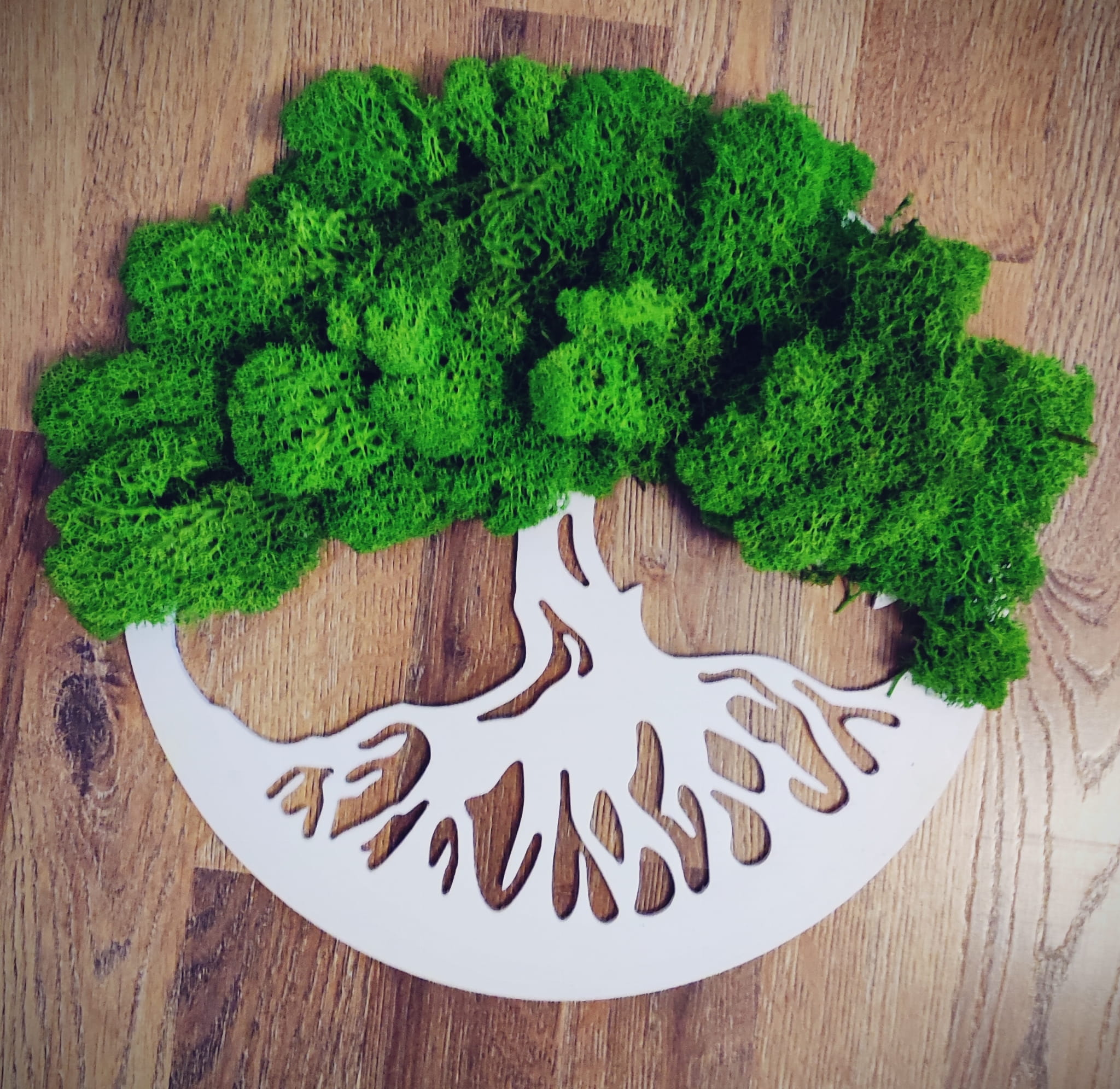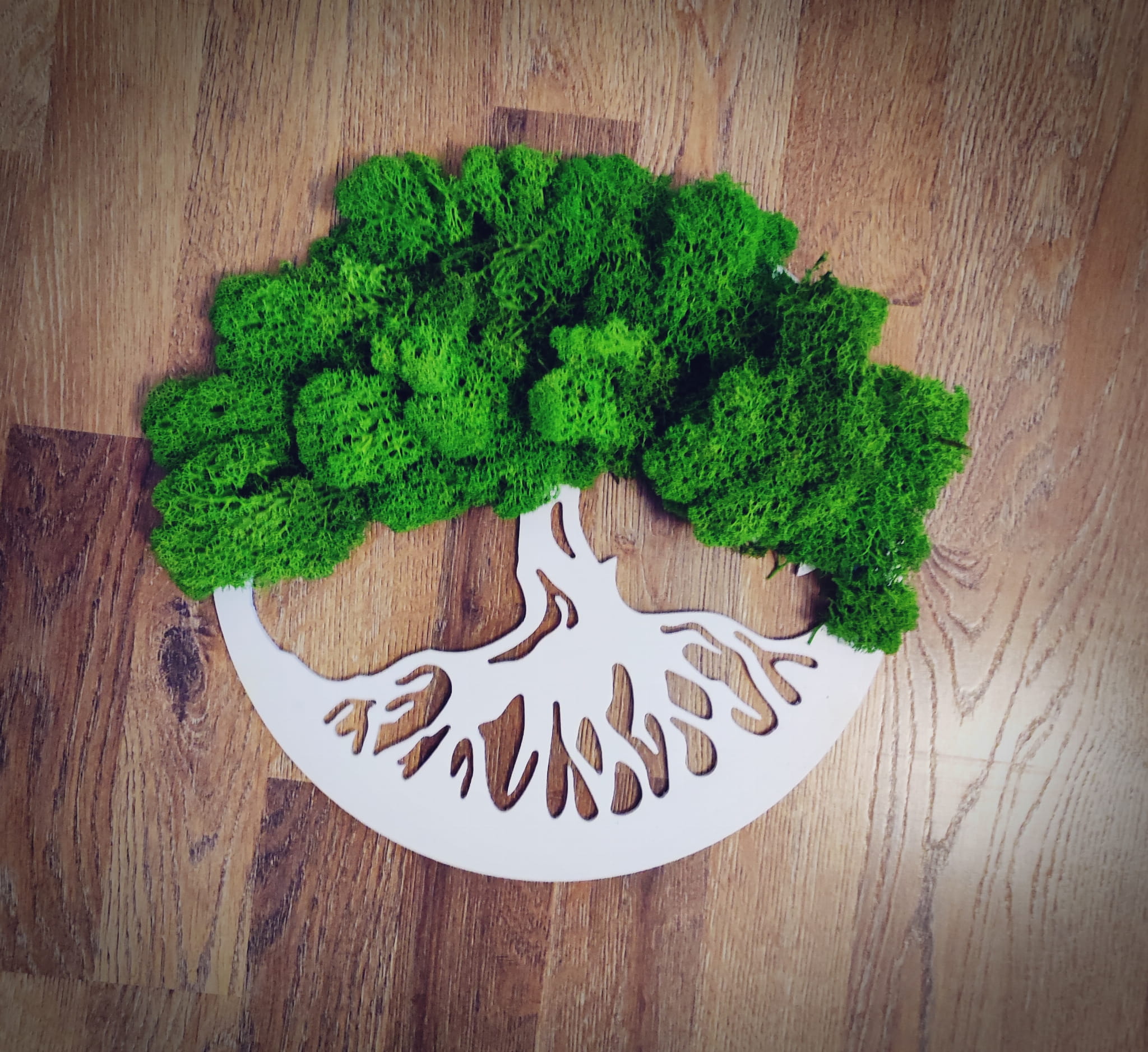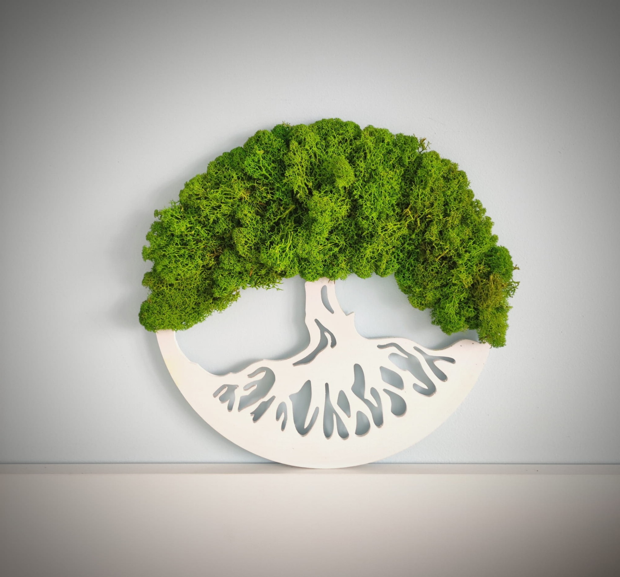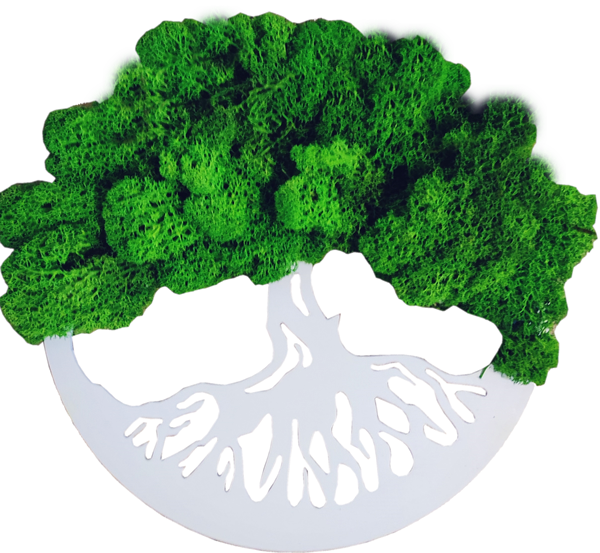 Drzewko okrągła ramka z chrobotkiem. Piękne drzewko szczęścia z żywą rośliną - chrobotkiem.