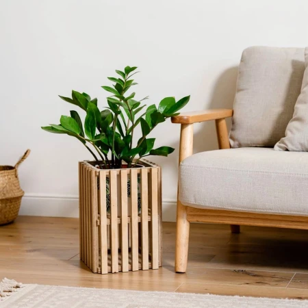 Niski kwietnik o wysokości 25 cm to idealne rozwiązanie dla miłośników detali. Dzięki unikalnej, ażurowej konstrukcji z pionowych listewek (lameli), produkt ten nadaje lekkości nawet masywnym roślinom. Świetnie sprawdzi się jako drewniana podstawa na parapet lub elegancki akcent na komodzie. Wykonany z jasnego, naturalnego drewna, doskonale eksponuje zieleń liści, tworząc mikroklimat w stylu eko w Twoim domu.