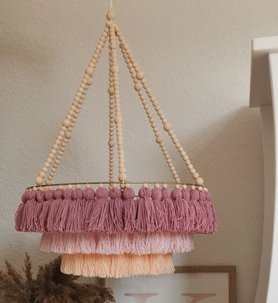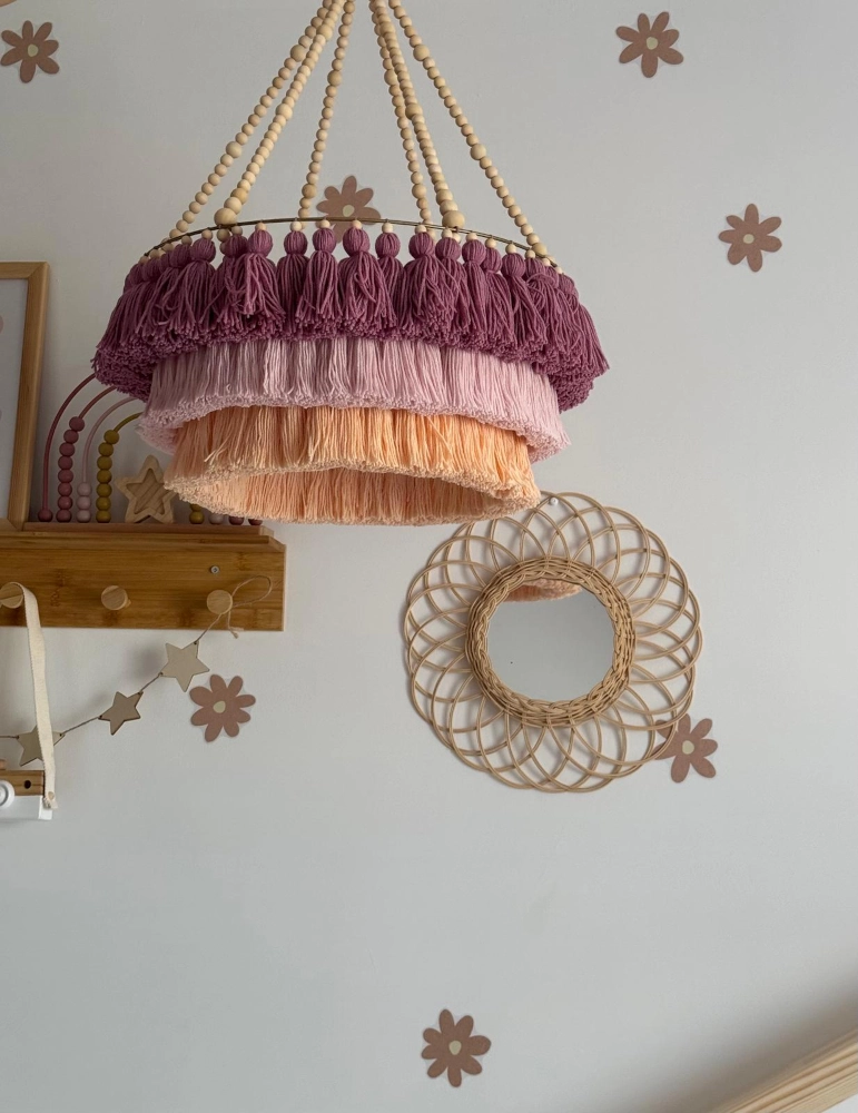 Lampa boho, polskie rękodzieło. Doskonale sprawdzi się w sypialni lub pokoju dziecięcym. Abażur do lampy jest wykonany ręcznie, co dodaje jej unikalnego charakteru i oryginalności.