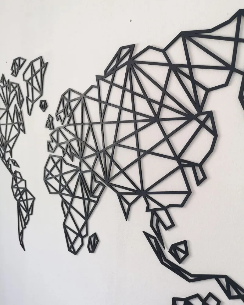 Drewniana ażurowa mapa świata w kolorze czarnym. Idealny pomysł na ciekawą aranżację do każdego rodzaju wnętrz. Oryginalna koncepcja dekoracji do salonu w stylu loft, sypialni lub pokoju młodzieżowego, doskonale będzie pasować do biurowej przestrzeni.