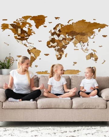 Drewniana Mapa Świata 3D Latte + zestaw montażowy