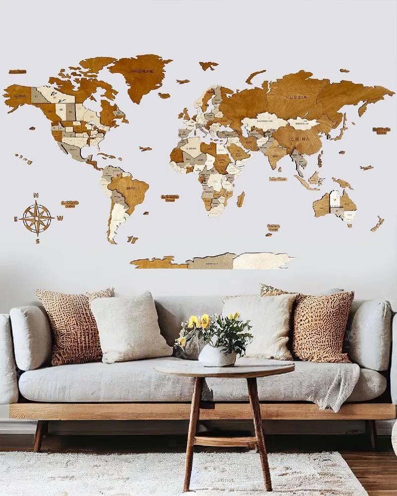 Drewniana Mapa Świata 3D Creme + szablon+ klej montażowy