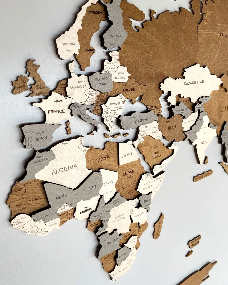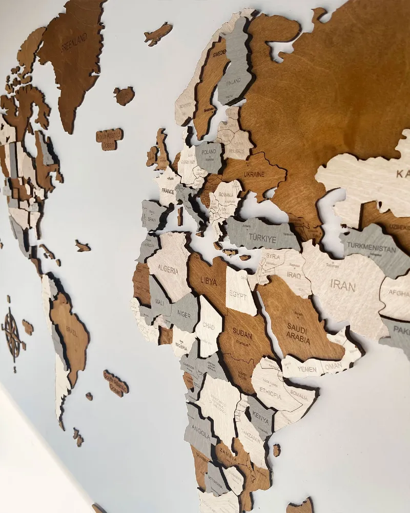 Drewniana Mapa Świata 3D w kolorze Creme. Efekt 3D mapy otrzymany jest poprzez sklejenie kilku drewnianych warstw o różnym usłojeniu.