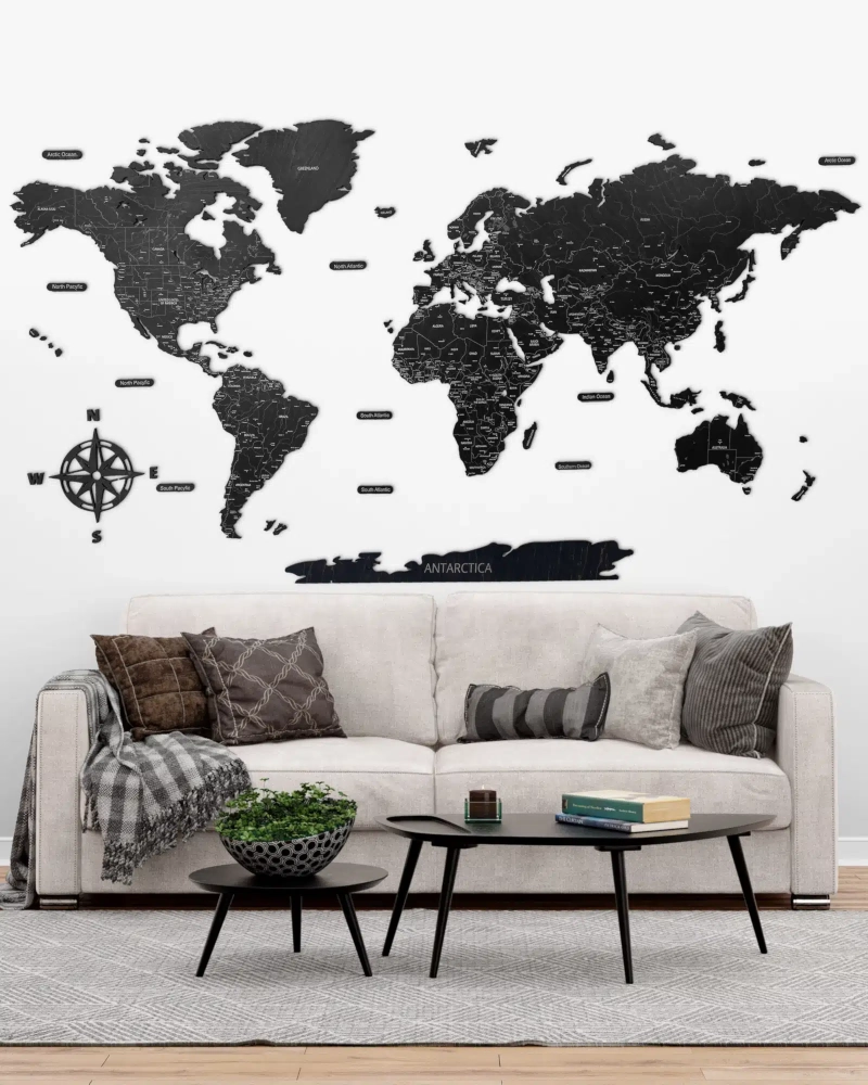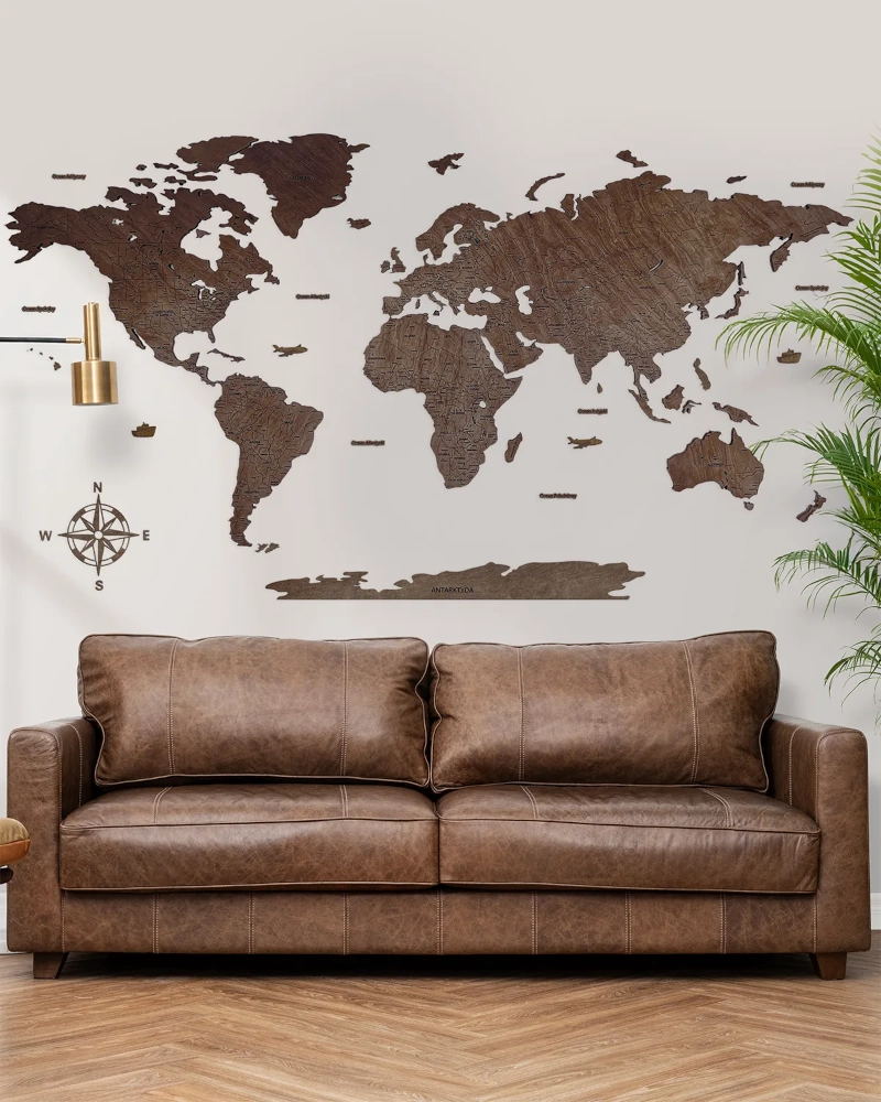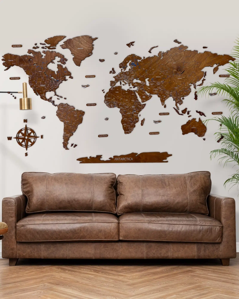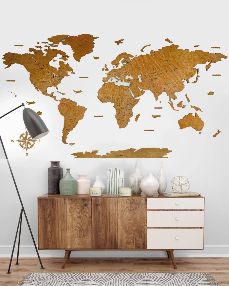 Drewniana Mapa Świata Premium Granice + Rzeki + Podpisy Państw, stolic i miast. Wykonana z naturalnej sklejki drewnianej o grubości 6mm, dostępna w 4 wariantach kolorystycznych (naturalny, dąb, orzech,czekoladowy, heban).