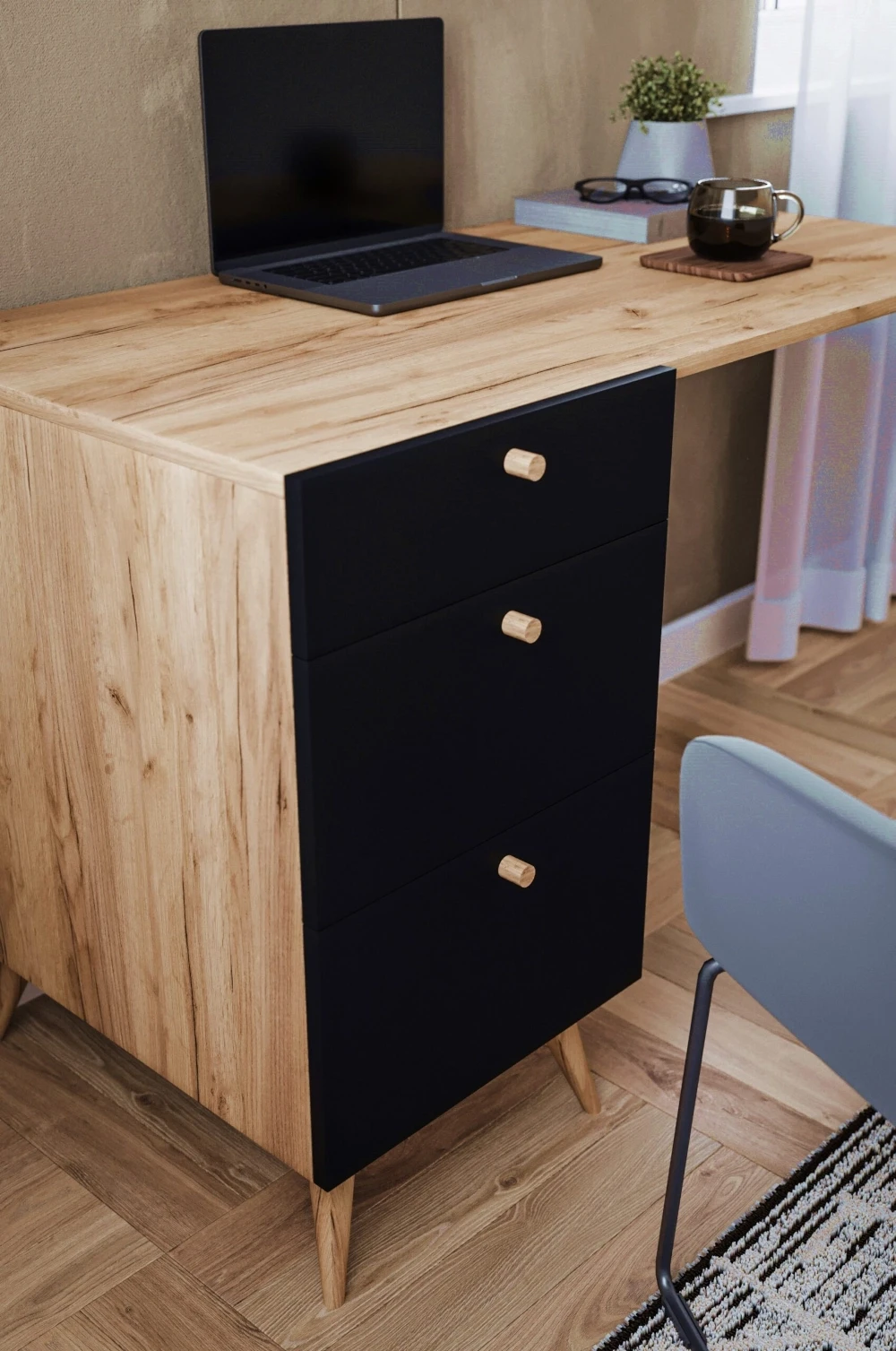 Biurko, które z powodzeniem sprawdzi się w pokoju dziecka lub biurze. Nogi z litego drewna bukowego zapewniające nie tylko ładny wygląd, ale również stabilność konstrukcji. Biurko posiada trzy bardzo pojemne szuflady.