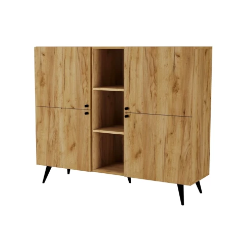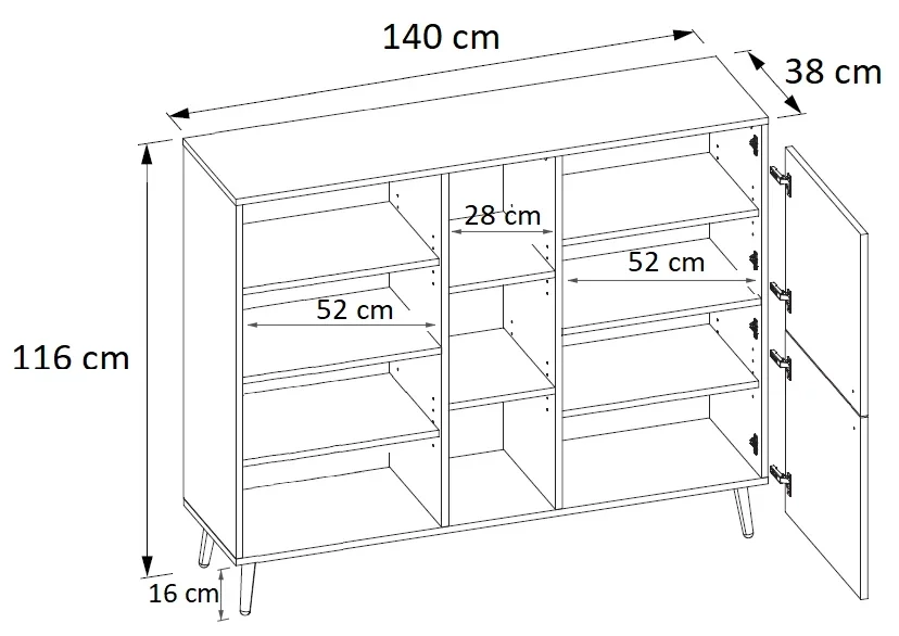 Bardzo pojemna komoda z szafkami i regulowanymi półkami. Świetnie wkomponuje się w pomieszczeniach w stylu skandynawskim. Produkt profesjonalnie przygotowywany do wysyłki, każdy element jest kontrolowany pod względem jakości.