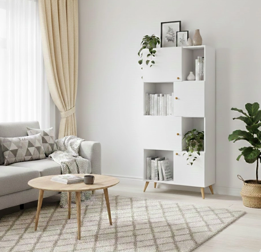Regał z kombinacją otwartej i ukrytej przestrzeni do przechowywania. Regał został wykonany z myślą o osobach ceniących nowoczesny i prosty styl. Nogi są z litego drewna. Niezastąpiony mebel w utrzymywaniu porządku w Twoich domu.
