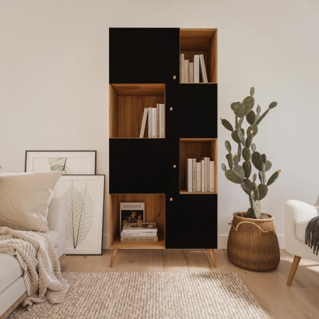Regał z kombinacją otwartej i ukrytej przestrzeni do przechowywania. Regał został wykonany z myślą o osobach ceniących nowoczesny i prosty styl. Nogi są z litego drewna. Niezastąpiony mebel w utrzymywaniu porządku w Twoich domu.