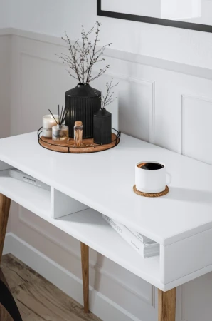 Białe biurko, które z powodzeniem sprawdzi się jako biurko do pracy w biurze, domu czy jako toaletka w sypialni. Nogi z litego drewna bukowego zapewniające nie tylko ładny wygląd, ale również stabilność konstrukcji.