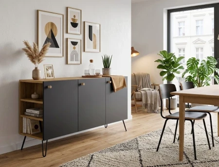 Bardzo pojemna komoda, wyróżniająca się bocznymi, otwartymi półeczkami.