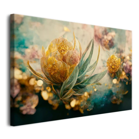 Wyjątkowy obraz na płótnie z motywem kwiatowym. Złoty kwiat w otoczeniu delikatnych barw. Wysoka jakość druku, idealny na prezent.