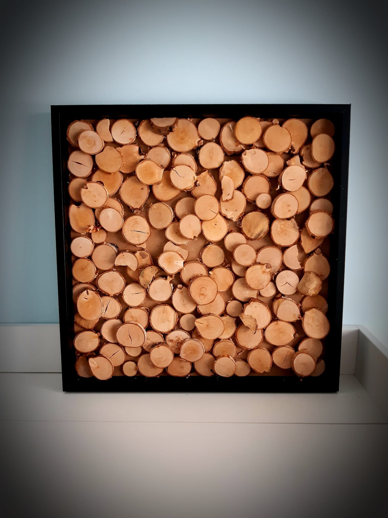 - kompozycja składa się z 3 obrazków (ramka z chrobotkiem, ramka z plastrami drewna, ramka z chrobotkiem i plastrami drewna, - patrz zdjęcia)