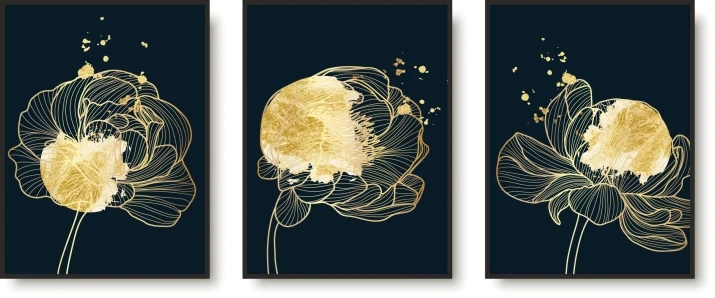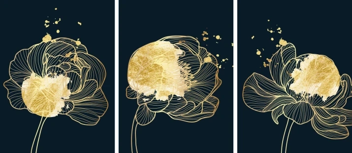 Wybierz zestaw złotych kwiatów line art, aby wprowadzić do swojego domu galeryjną jakość i niepowtarzalny, biżuteryjny styl dekoracji ściennej.
