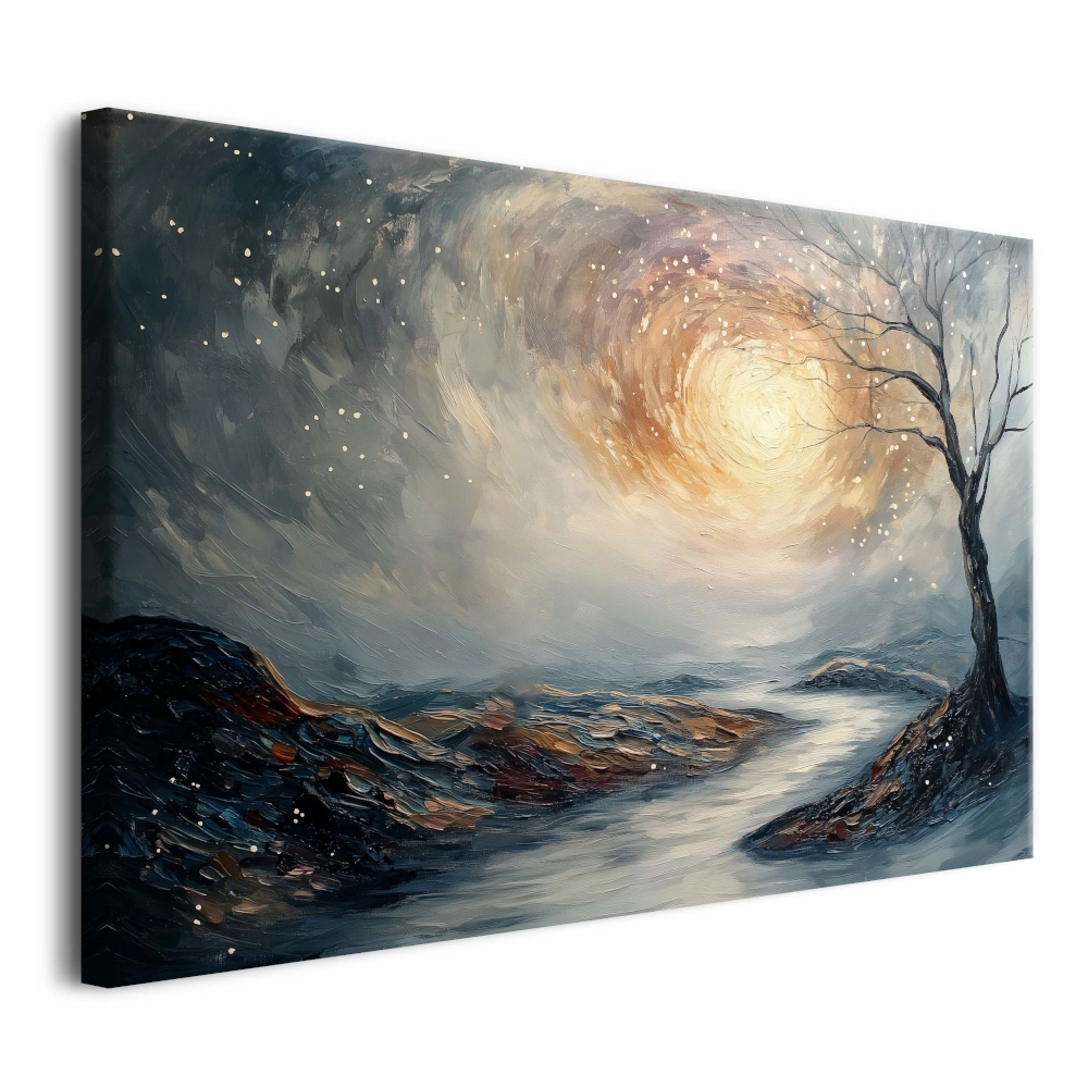 Obraz przedstawiający nocny krajobraz z samotnym drzewem to doskonały wybór do salonu. Jego uniwersalny charakter i spokojna atmosfera sprawią, że będzie on piękną ozdobą każdego wnętrza.