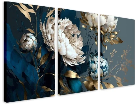 Obraz na płótnie canvas tryptyk niebieski, złoty, kwiaty