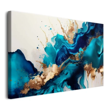 Szukasz wyjątkowej dekoracji ściennej? Ten obraz to doskonały wybór dla osób ceniących nowoczesne i oryginalne rozwiązania w dekoracji wnętrz. Głęboki błękit, turkus i złote akcenty tworzą harmonijną i przyciągającą wzrok paletę. Obraz ten można zaliczyć do sztuki abstrakcyjnej, która charakteryzuje się swobodą wyrazu i brakiem konkretnych odniesień do rzeczywistości.