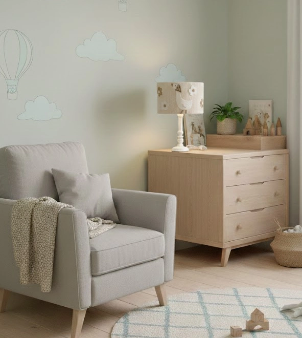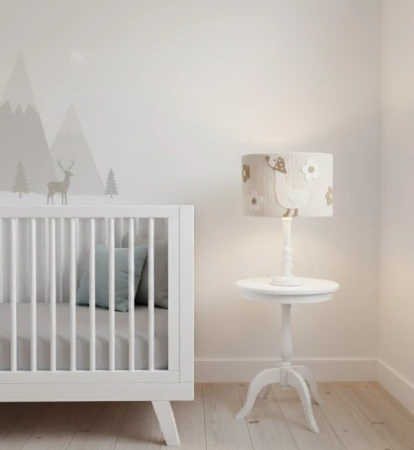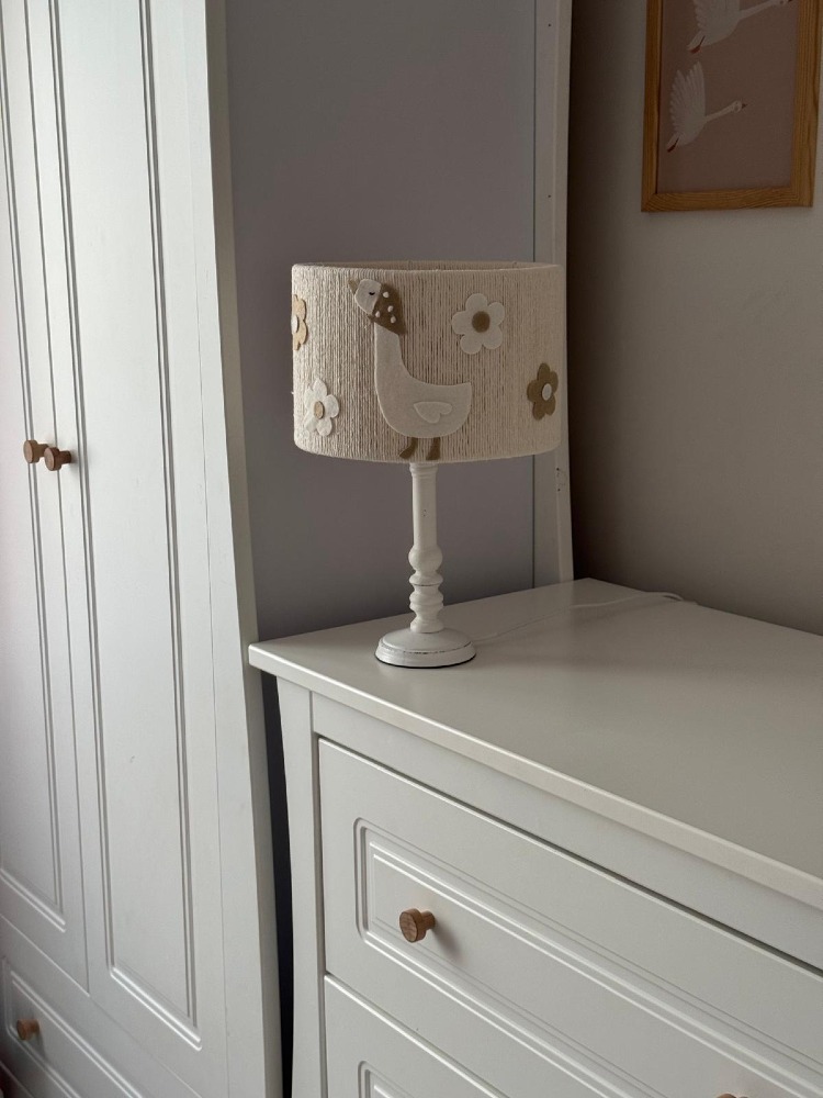 Abażur został wykonany z bawełnianego sznurka oplatającego metalowy stelaż, ozdobiony gąską i kwiatkami. Wyjątkowy i elegancki design wniesie artystyczny charakter do pokoju dziecka.