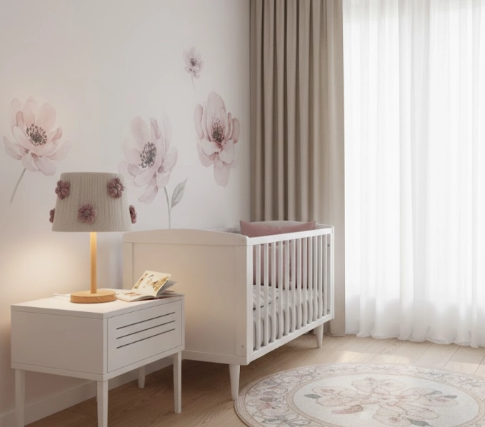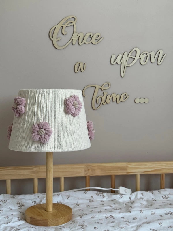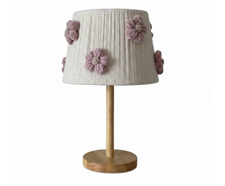 Abażur został wykonany z bawełnianego sznurka oplatającego metalowy stelaż, ozdobiony kwiatkami. Wyjątkowy i elegancki design wniesie artystyczny charakter do pokoju dziecka.