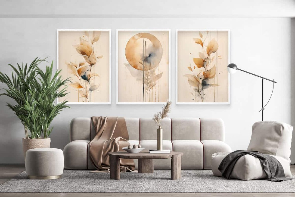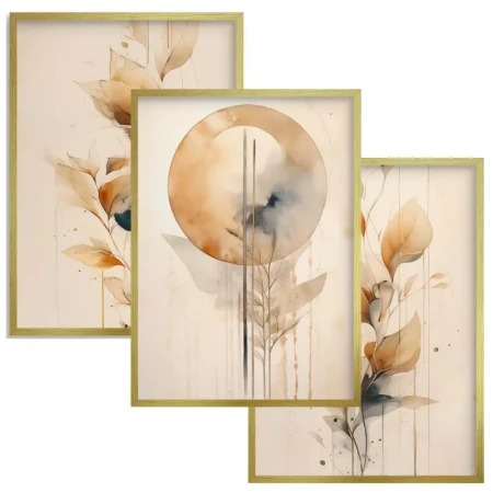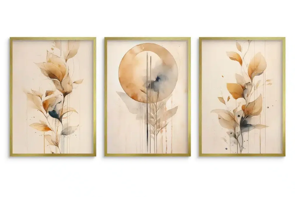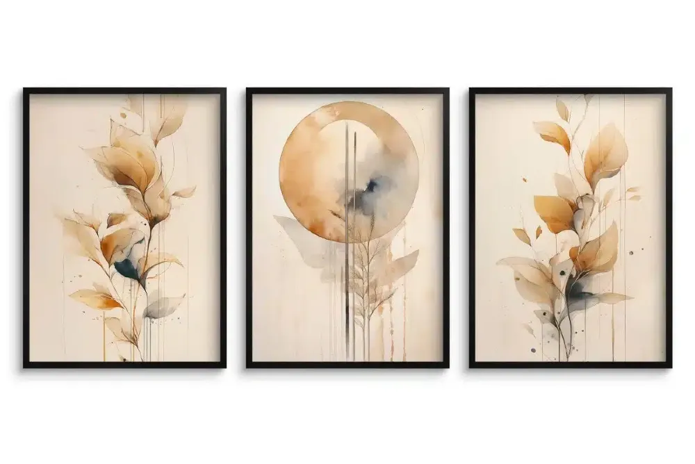 Zanurz swoje wnętrze w kojących odcieniach piasku i ciepłego karmelu. Ten zestaw to kwintesencja delikatności – rozmyte linie akwareli i subtelne motywy roślinne tworzą atmosferę sprzyjającą relaksowi. To idealny wybór do pomieszczeń, które mają być Twoją oazą spokoju.