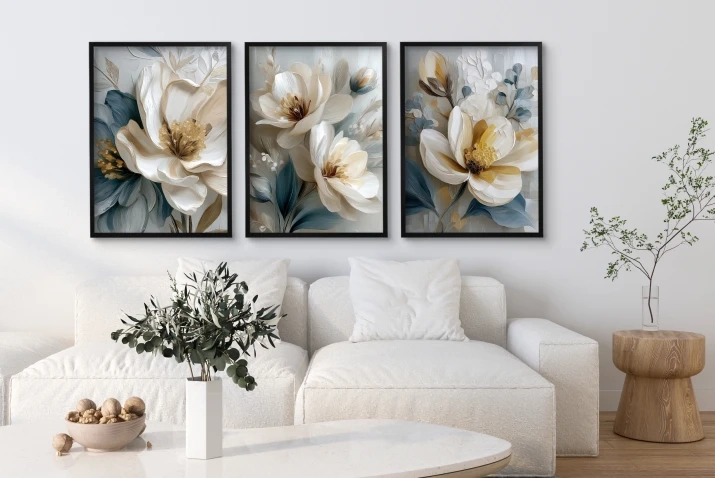 Zestaw ten tworzy spójną, harmonijną galerię ścienną, która wizualnie powiększa przestrzeń i dodaje jej głębi.