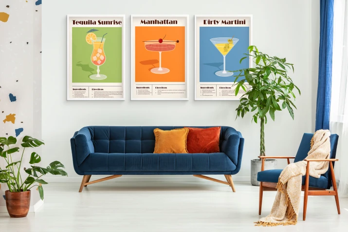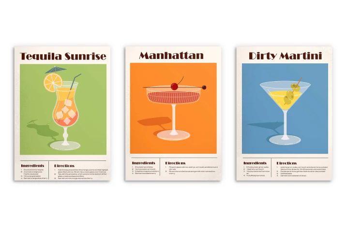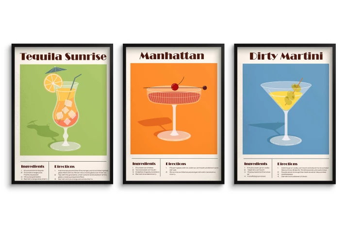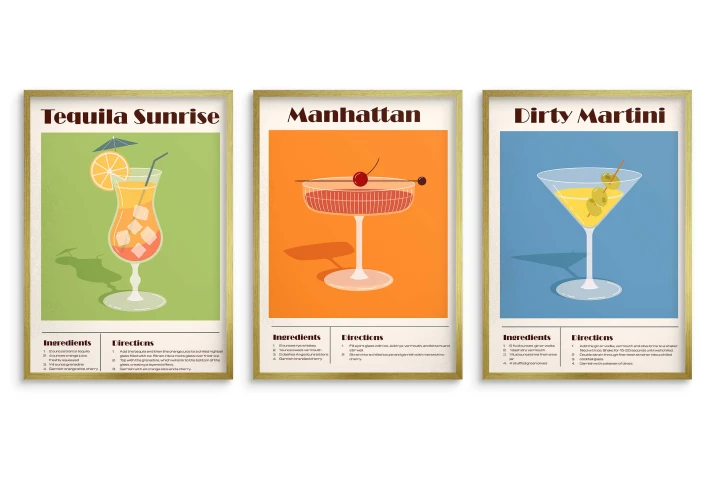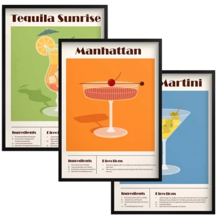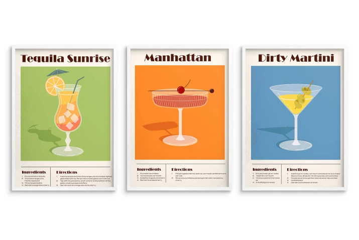 Stwórz klimatyczny, retro nastrój w swojej kuchni, jadalni lub domowym barku dzięki temu unikalnemu zestawowi 3 plakatów. Ten tryptyk to idealne połączenie modnego designu Vintage / Retro z funkcjonalnym elementem – przepisami na klasyczne koktajle takie jak Manhattan, Tequila Sunrise i Dirty Martini.