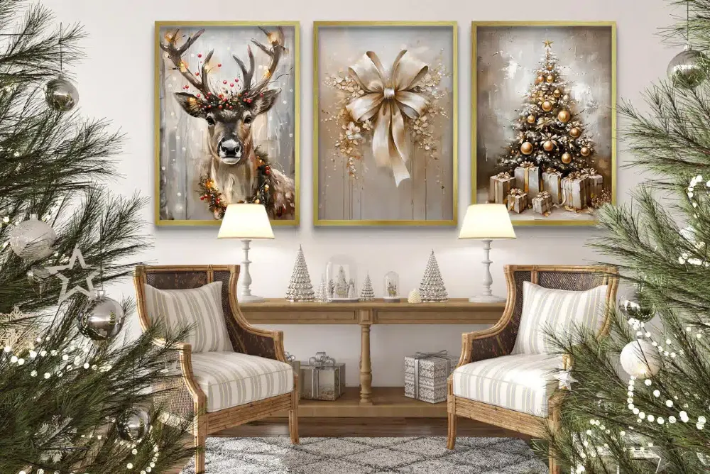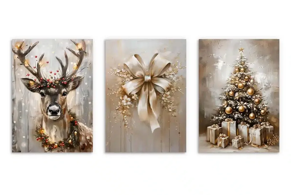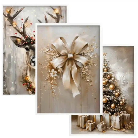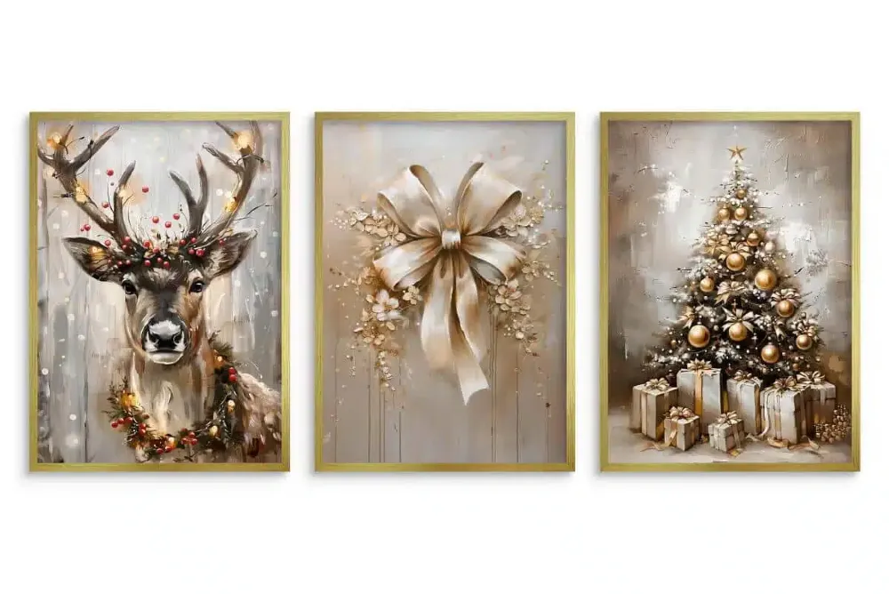 Odkryj świąteczny luksus! Zestaw plakatów "Złota Elegancja" – jeleń, kokarda, choinka. Dostępne z ramą lub bez. Stwórz stylowy dom z PatiHome!