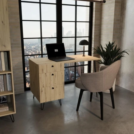 Biurko, które z powodzeniem sprawdzi się w pokoju dziecka lub biurze. Nogi metalowe typu hairpin, zapewniające nie tylko ładny wygląd, ale również stabilność konstrukcji. Biurko posiada trzy bardzo pojemne szuflady.