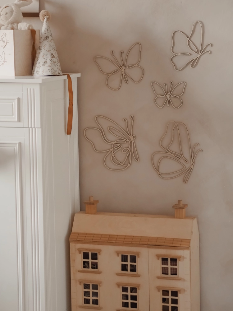 Wprowadź do pokoju swojego dziecka lekkość i artystyczny sznyt dzięki naszej kolekcji dekoracji One Line Art. Te unikalne ozdoby, wykonane z naturalnej polskiej sklejki, to połączenie nowoczesnego minimalizmu z ciepłem natury. Subtelne linie tworzą kształty motyli, które wyglądają, jakby zostały narysowane jedną kreską prosto na Twojej ścianie.