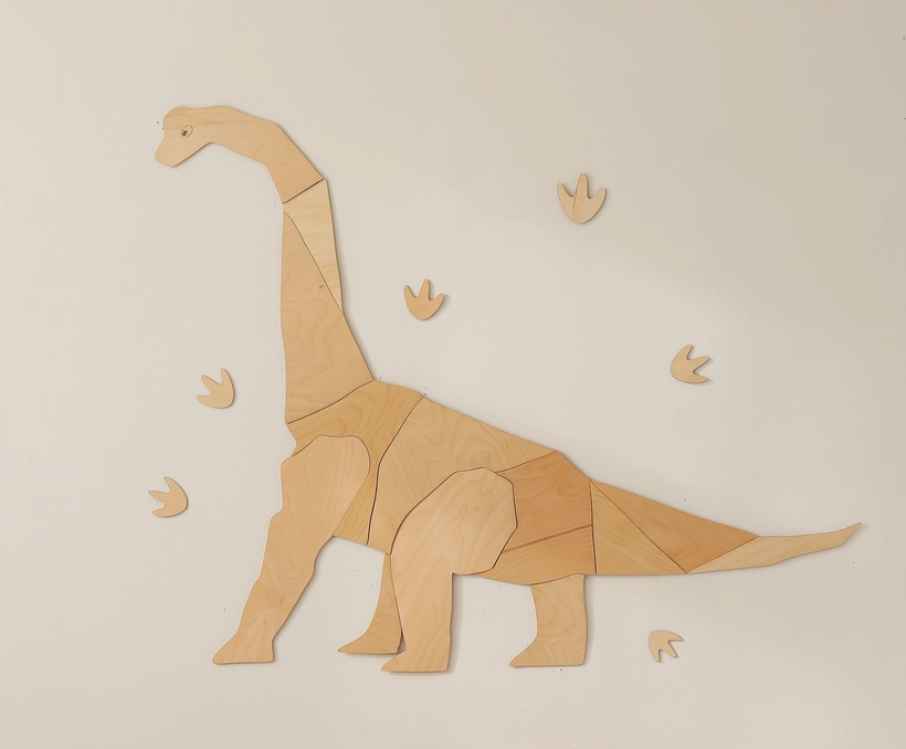 Ten składający się z kilkunastu elementów zwierzak to nie tylko dekoracja, ale i puzzle. Zanim trafi na ścianę, możecie razem z dzieckiem ułożyć go na podłodze, ciesząc się chwilą wspólnej, kreatywnej zabawy. Dinozaur może być zamontowany w odbiciu lustrzanym. Do zestawu dołączone są drewniane ślady dinozaurów!