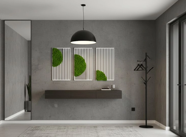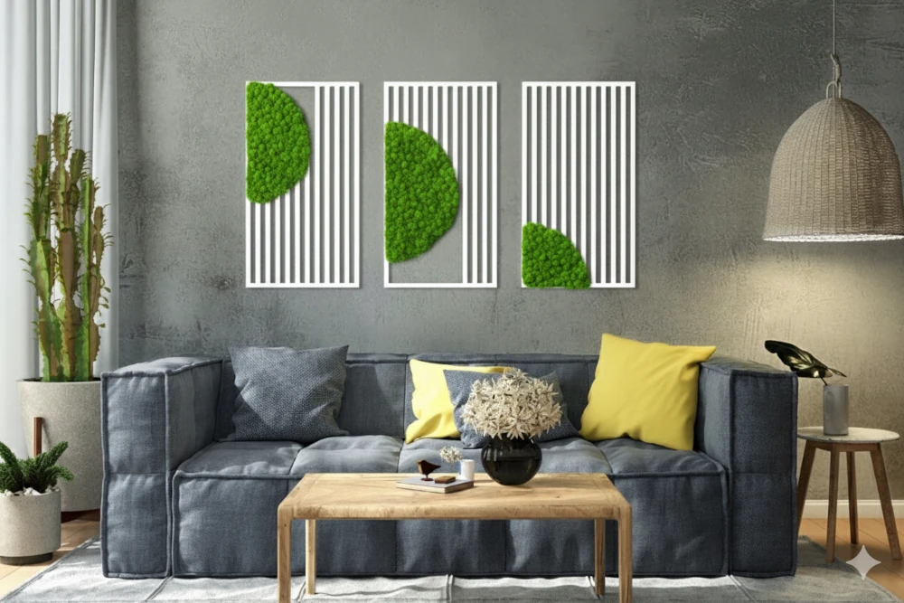 Wprowadź naturę do swojego domu w najbardziej elegancki sposób! Ten zestaw 3 obrazów z chrobotkiem reniferowym to więcej niż dekoracja – to bezobsługowy element biophilic design. Obrazy składają się z ażurowych paneli oraz soczyście zielonego, stabilizowanego mchu, tworząc unikalną kompozycję geometryczną.