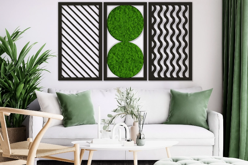 Stwórz unikalną i relaksującą atmosferę w swoim wnętrzu dzięki naszemu wyjątkowemu tryptykowi, łączącemu minimalistyczny design z naturalnym akcentem. Ten zestaw trzech paneli dekoracyjnych to idealne rozwiązanie, aby dodać elegancji salonowi, sypialni czy biuru, wprowadzając jednocześnie element żywej zieleni.
