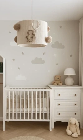 Ta lampa to prawdziwa perełka! Ręcznie robiona, z naturalnego sznurka, z uroczym misiem trzymającym balonik i puszystymi pomponami. Idealna, żeby wprowadzić do wnętrza spokój i przytulność, sprawiając, że każdy wieczór będzie jak podróż do krainy najpiękniejszych snów. Wystarczy ją włączyć, a znikną wszystkie potwory spod łóżka, a pojawią się tylko słodkie sny!