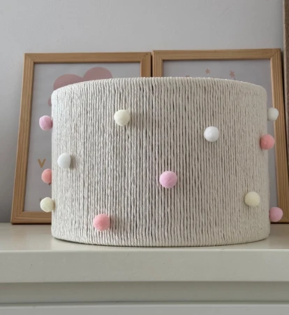 Abażur jest wykonany z naturalnego materiału, bawełnianego sznurka. Kształt walca. Ozdobiony mini pomponami.