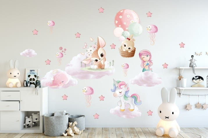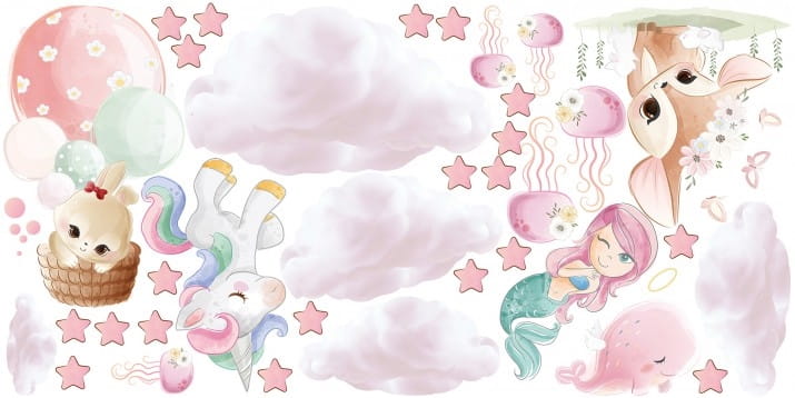 Barwne i efektowne naklejki do pokoju dziecka - syrenka, kucyk, chmurki. Bogaty wybór naklejek pozwoli Ci przebierać w wielu ciekawych propozycjach. Zarówno wzory uniwersalne, jak również do pokoju chłopca, czy dziewczynki.