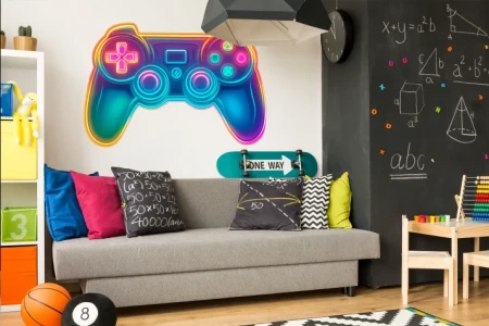 Ta naklejka to prawdziwa gratka dla fana gier wideo. Przedstawia duży, kolorowy kontroler, stylizowany na neonowy znak świetlny. Główne kolory to wyrazisty błękit i turkus, które przechodzą w jaskrawe, neonowe kontury w odcieniach różu, pomarańczy i żółci. Daje to niesamowity efekt trójwymiarowości i blasku, jakby kontroler faktycznie świecił w ciemności.