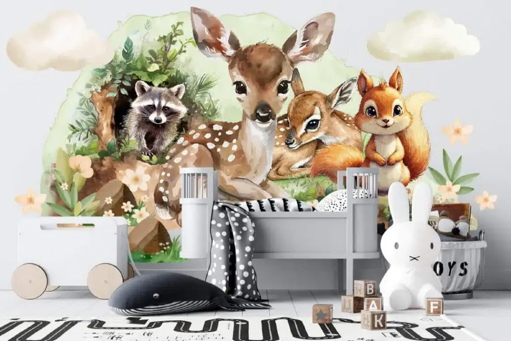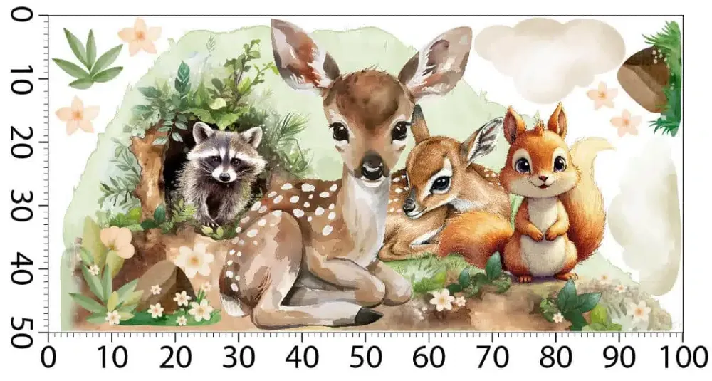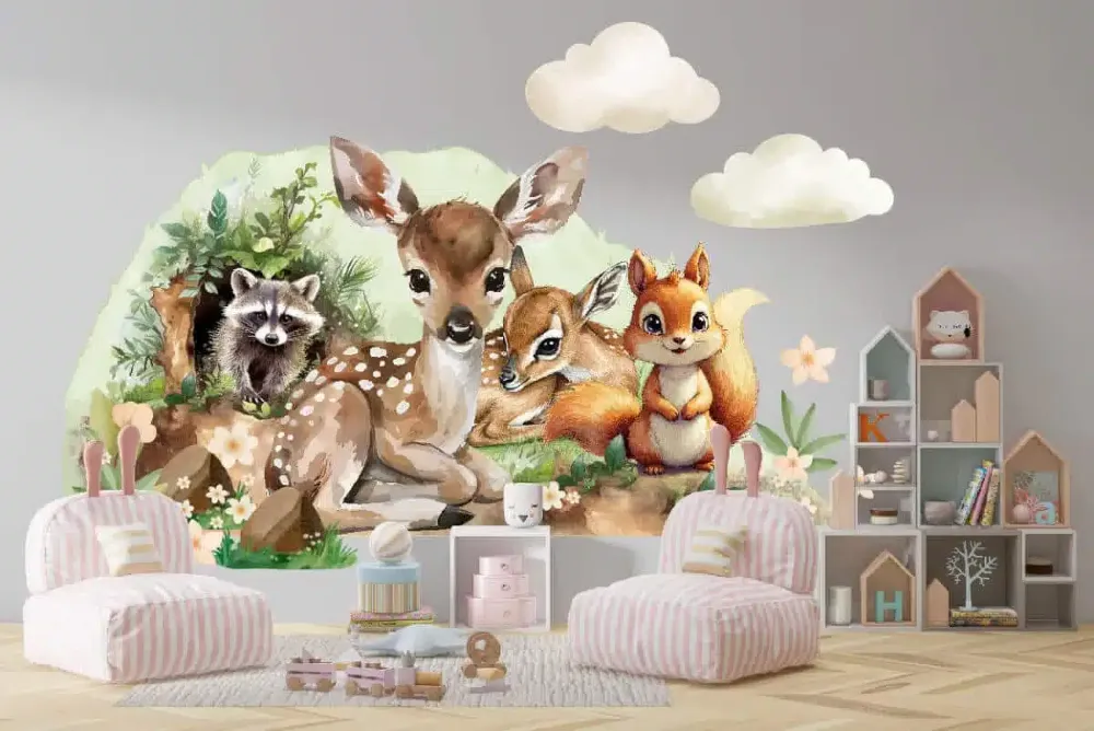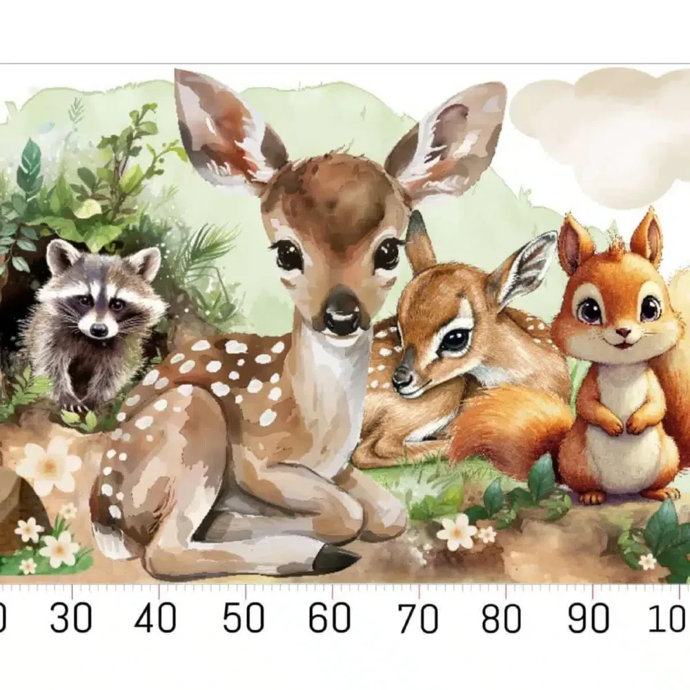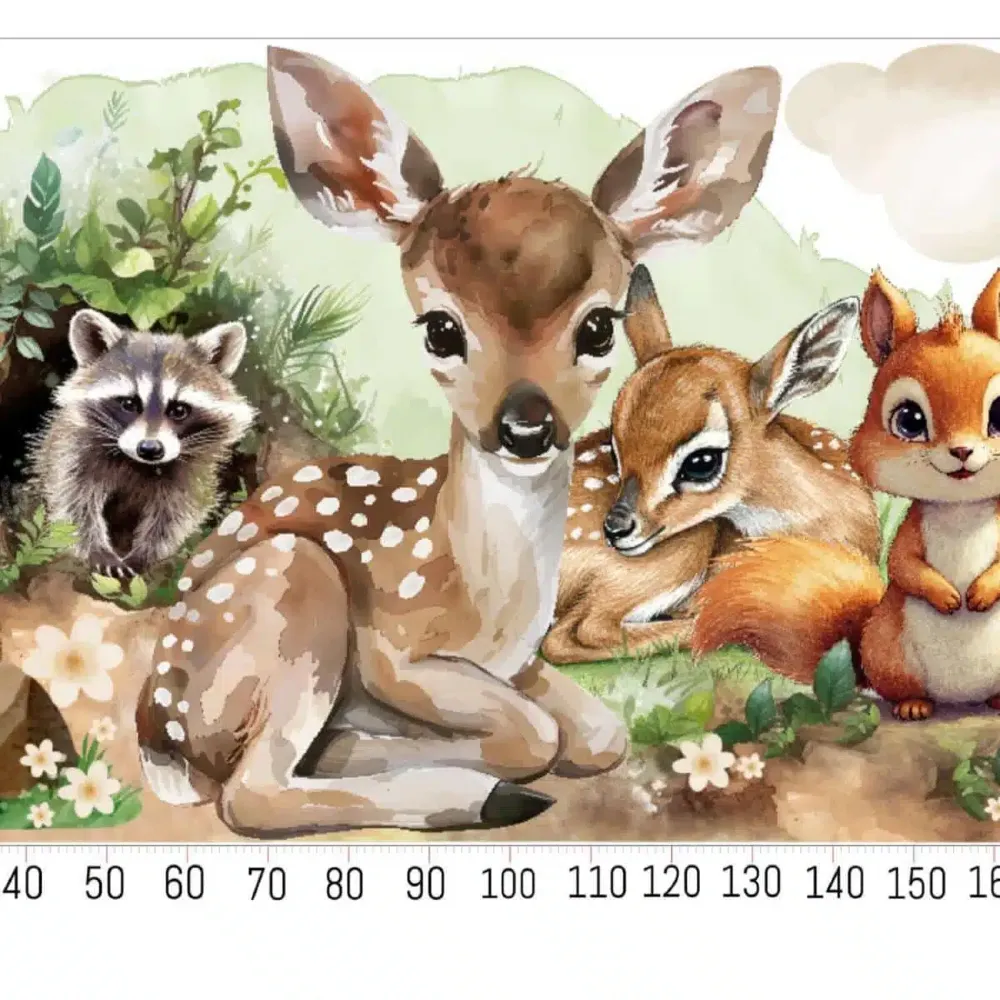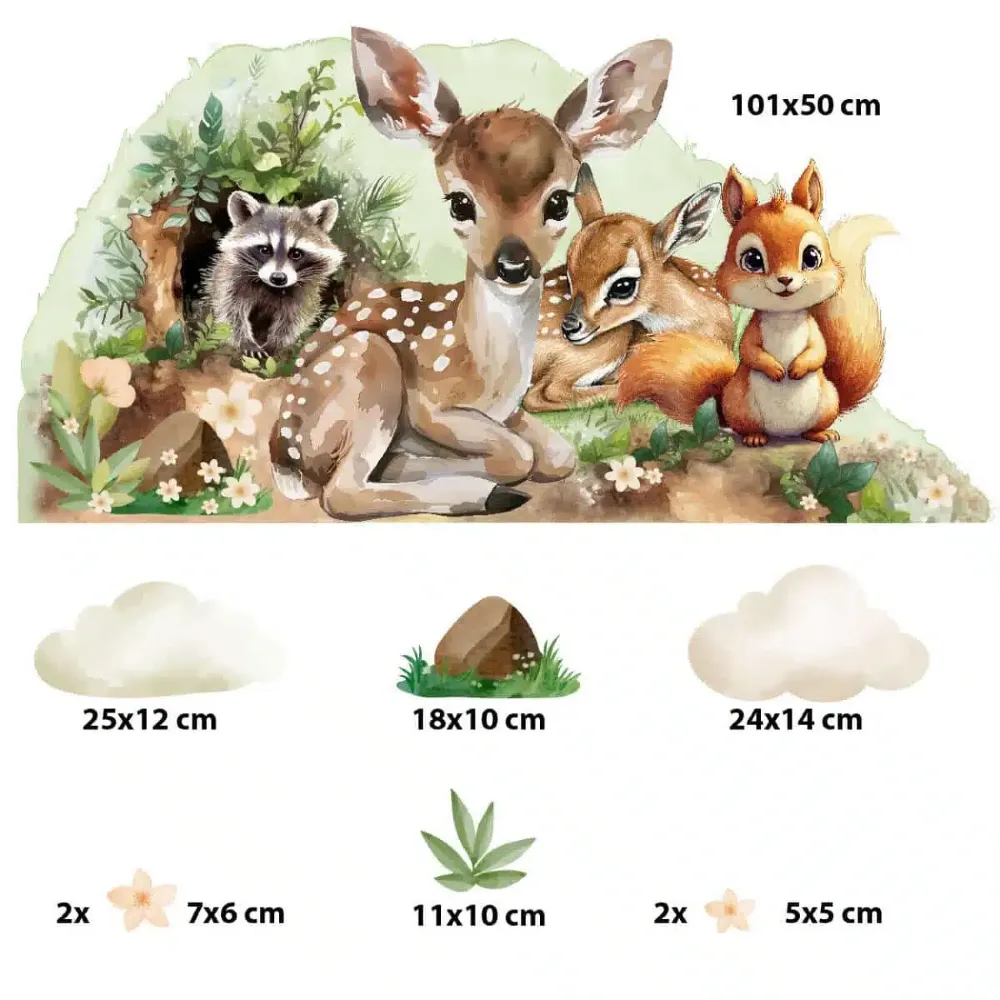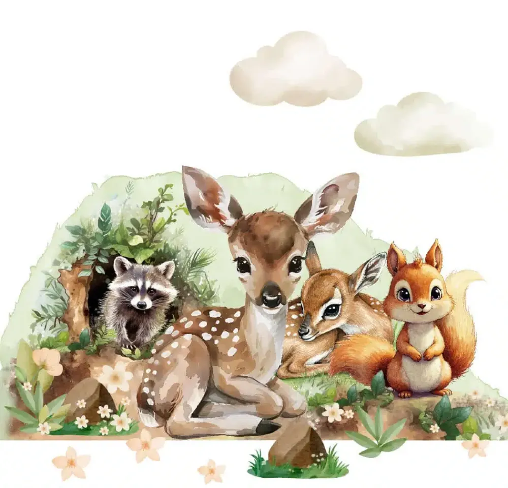 Przekształć pokój swojego maluszka w krainę pełną spokoju i przygód. Zestaw naklejek ściennych to subtelna dekoracja, która nada wnętrzu przytulny, skandynawski charakter. Urocze sarenki, wiewiórka, szop, otoczeni puszystymi chmurkami.