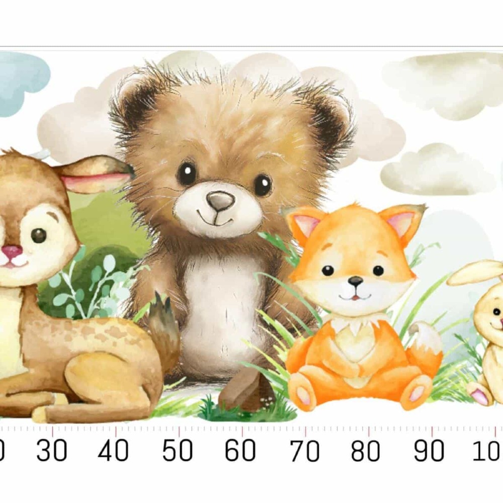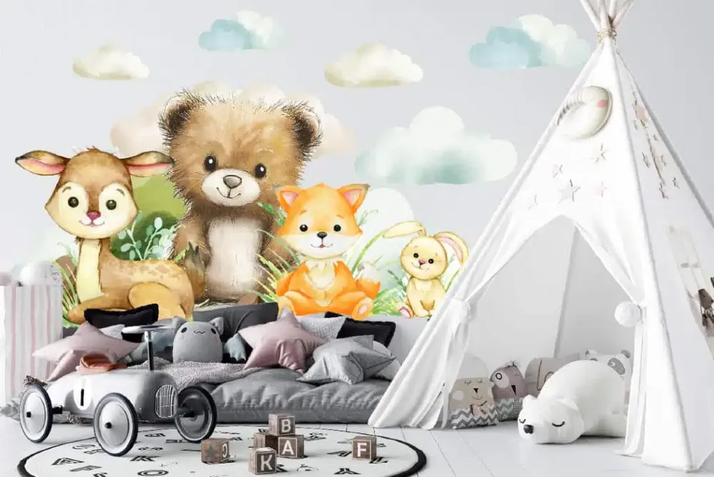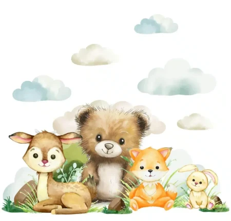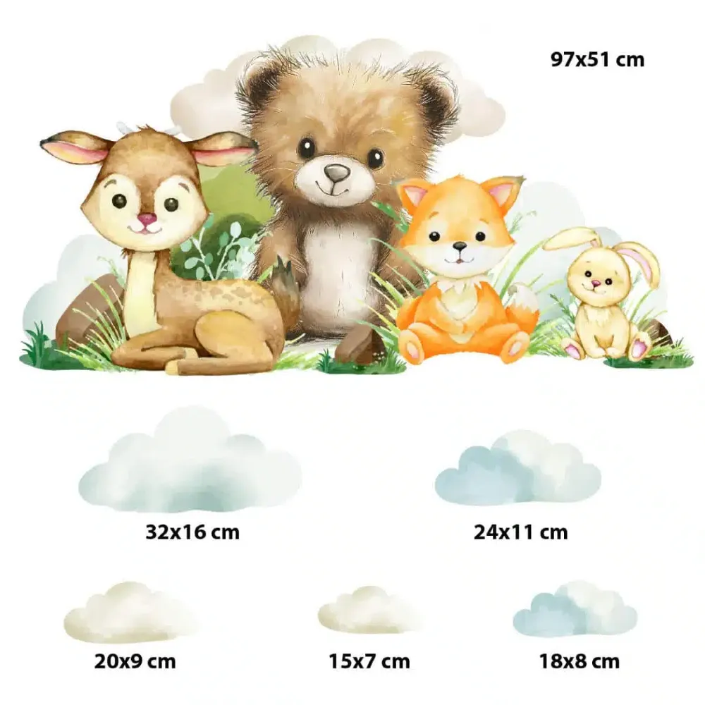 Przekształć pokój swojego maluszka w krainę pełną spokoju i przygód. Zestaw naklejek ściennych to subtelna dekoracja, która nada wnętrzu przytulny, skandynawski charakter. Uroczy niedźwiadek, jelonek, lisek oraz zajączek, otoczeni puszystymi chmurkami.