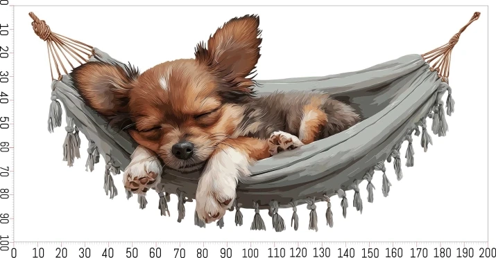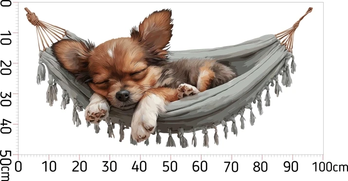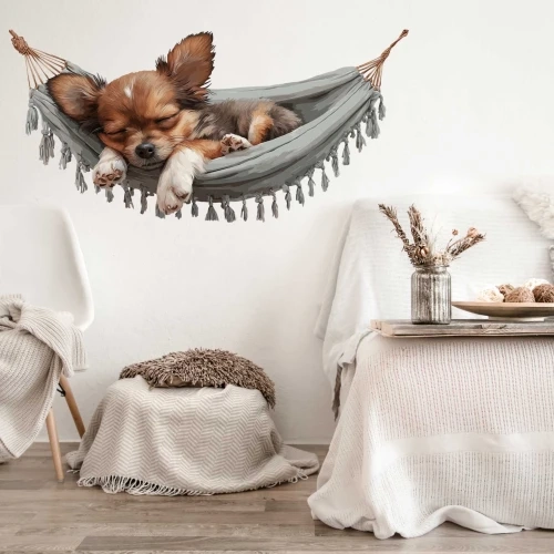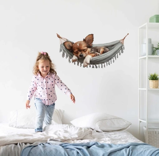Ten mały chihuahua, słodko śpiący w hamaku, to idealny sposób na dodanie odrobiny słodyczy i spokoju do pokoju dziecka. Naklejka świetnie pasuje nad łóżeczko, kącik zabaw, albo w dowolne miejsce, które chcesz uczynić bardziej przytulnym.