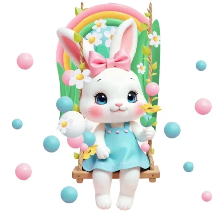 Naklejka ścienna przedstawia siedzącego na huśtawce białego króliczka z długimi uszami. Ta wesoła i kolorowa dekoracja ścienna będzie idealna do pokoju dziecięcego, tworząc w nim radosną i bajkową atmosferę. Zestaw zawiera wiele elementów, co daje możliwość stworzenia unikalnej kompozycji na ścianie.
