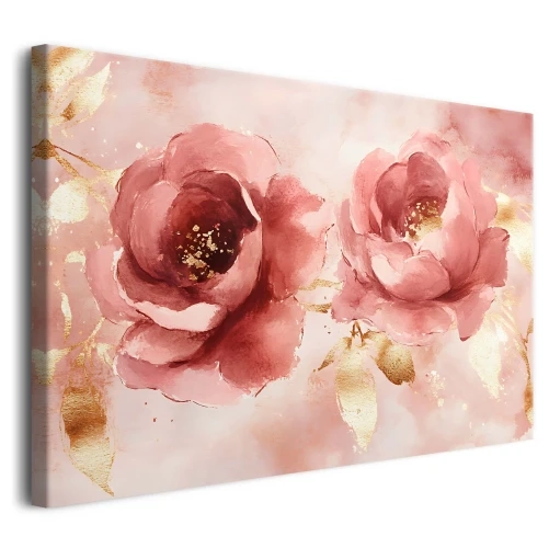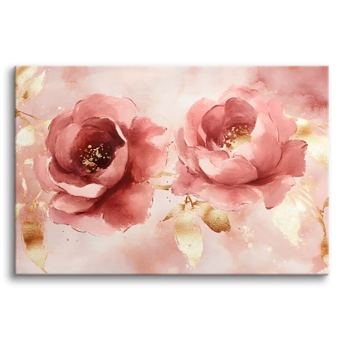 Przedstawia on delikatne, rozkwitające różowe kwiaty, muśnięte luksusowymi złotymi akcentami, tworząc kompozycję pełną romantyzmu i blasku. Ten stylowy wydruk na płótnie to doskonały sposób, aby wnieść do Twojego domu atmosferę luksusu i subtelnej gracji, idealnie komponując się zarówno w przytulnej sypialni, jak i reprezentacyjnym salonie.