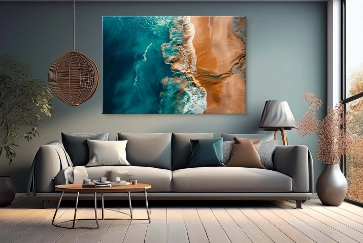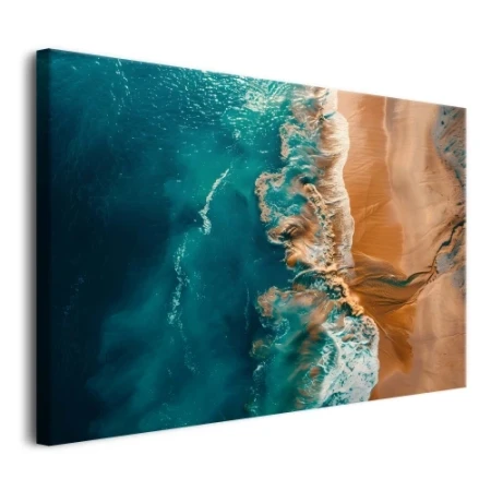 Obraz przedstawia widok z lotu ptaka na brzeg morza, gdzie głęboki, turkusowy ocean łączy się ze złotą, piaszczystą plażą. Dynamika fal i spienionej wody kontrastuje ze spokojem lądu, a widoczne z góry pęknięcia w piasku dodają kompozycji naturalności i struktury. Taka perspektywa nadaje wnętrzu unikalnego charakteru i optycznie je powiększa, wprowadzając do salonu energię i poczucie wolności.