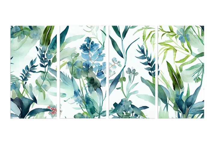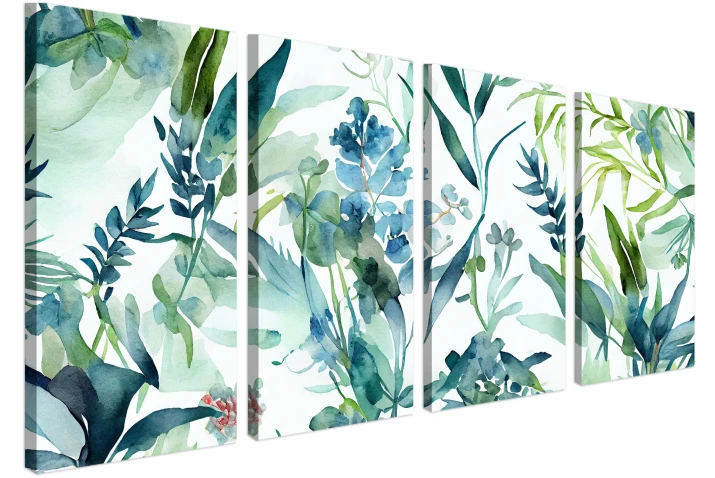 Ten czteroczęściowy obraz na płótnie z liśćmi w odcieniach morskiego błękitu i soczystej zieleni działa na domowników lepiej niż melisa, wprowadzając do wnętrza spokój i upragniony balans.