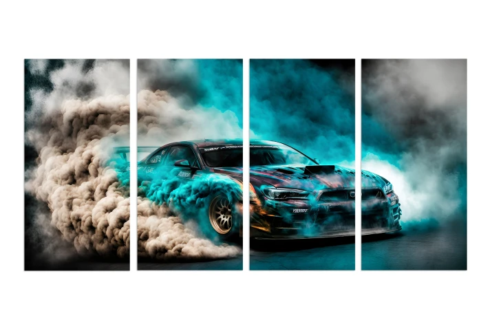 Ten czteroczęściowy obraz na płótnie z samochodem sportowym musi wylądować na Twojej ścianie. Dynamiczne ujęcie driftującej maszyny w kłębach dymu i neonowym, turkusowym świetle sprawia, że Twój pokój zyska energię toru wyścigowego.