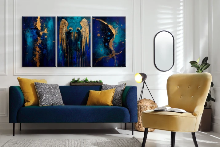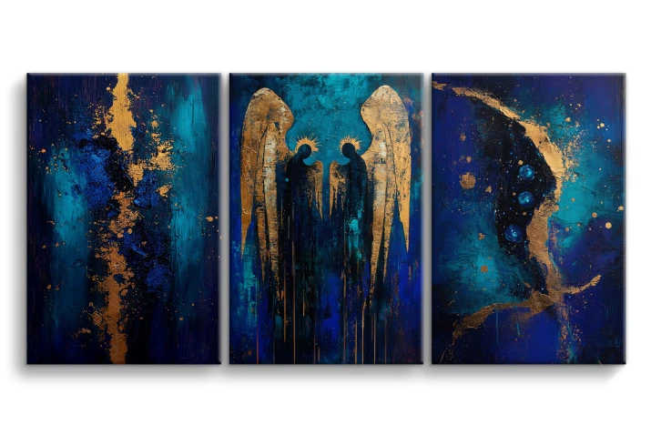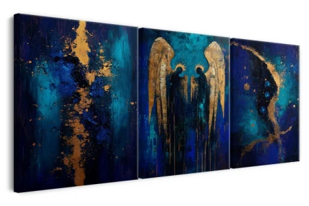 Na środkowym obrazie, majestatyczne skrzydła aniołów zdają się otaczać i chronić, a na bocznych panelach, złote akcenty mienią się na ciemnym tle niczym gwiazdy na nocnym niebie. To idealny dodatek do salonu lub sypialni, który nie tylko udekoruje wnętrze, ale też doda mu spokoju i wyjątkowej energii.