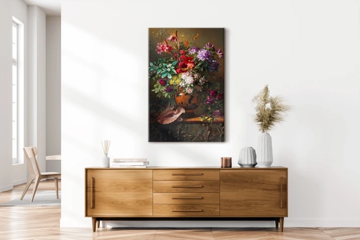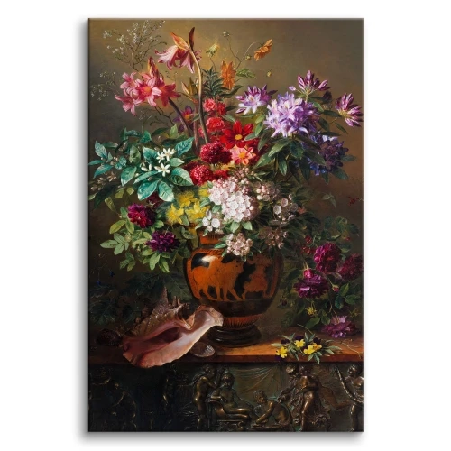 Obraz oddaje bujność bukietu w wazonie, ukazując bogactwo różnorodnych kwiatów w pełnym rozkwicie. Odcienie czerwieni, różu, fioletu, bieli i zieleni tworzą harmonijną, ale jednocześnie dynamiczną kompozycję. Każdy płatek, liść i łodyga zostały namalowane z niezwykłą precyzją, co sprawia, że kwiaty zdają się niemal ożywać na płótnie. Dodatkowe elementy, takie jak muszla czy rzeźbiona podstawa, wzbogacają scenę, nadając jej luksusowego charakteru i historycznej głębi. To scena prosta, a jednocześnie nasycona wyrafinowaniem, która wniesie do każdego pomieszczenia powiew świeżości i artystycznego nastroju.