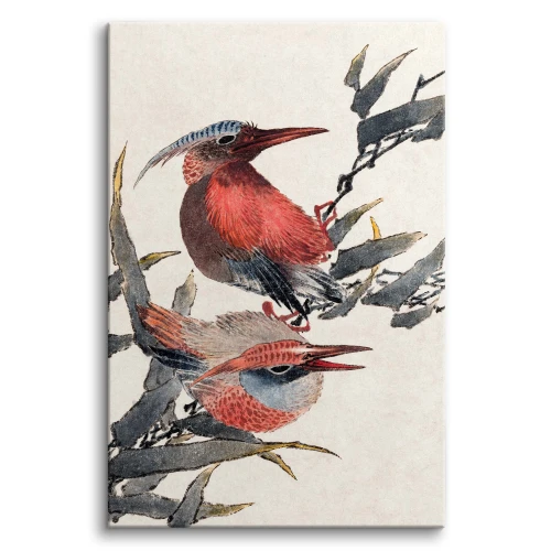 Ta wyjątkowa reprodukcja na płótnie ożywia wnętrze żywą paletą i naturalną dynamiką, charakterystyczną dla japońskiej estetyki Kachō-ga (ptaki i kwiaty). Obraz przedstawia dwa niewielkie ptaki – prawdopodobnie rudziki lub pokrzewki – uchwycone w momencie głośnej interakcji na tle gałęzi.