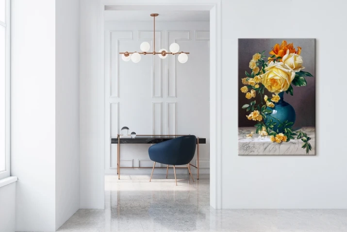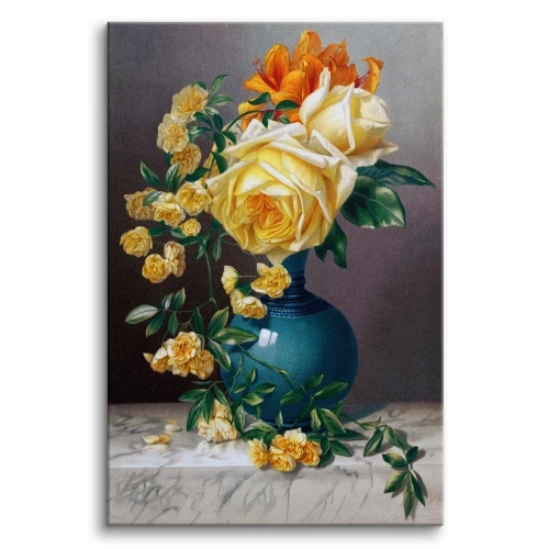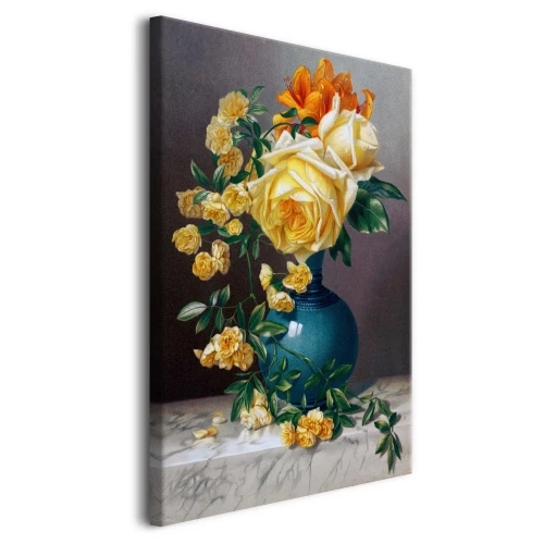 Na reprodukcji możesz podziwiać bujny bukiet w wazonie, w którym dominują pełne, cudowne żółte róże w towarzystwie pomarańczowych kwiatów. Kompozycja jest niezwykle elegancka, a misternie oddane detale płatków i liści świadczą o kunszcie artysty. Turkusowy wazon stanowi piękny kontrast dla ciepłych barw kwiatów, a marmurowy blat dodaje całości szlachetności. To scena prosta, a jednocześnie nasycona wyrafinowaniem, która wniesie do każdego pomieszczenia powiew świeżości i artystycznego nastroju.